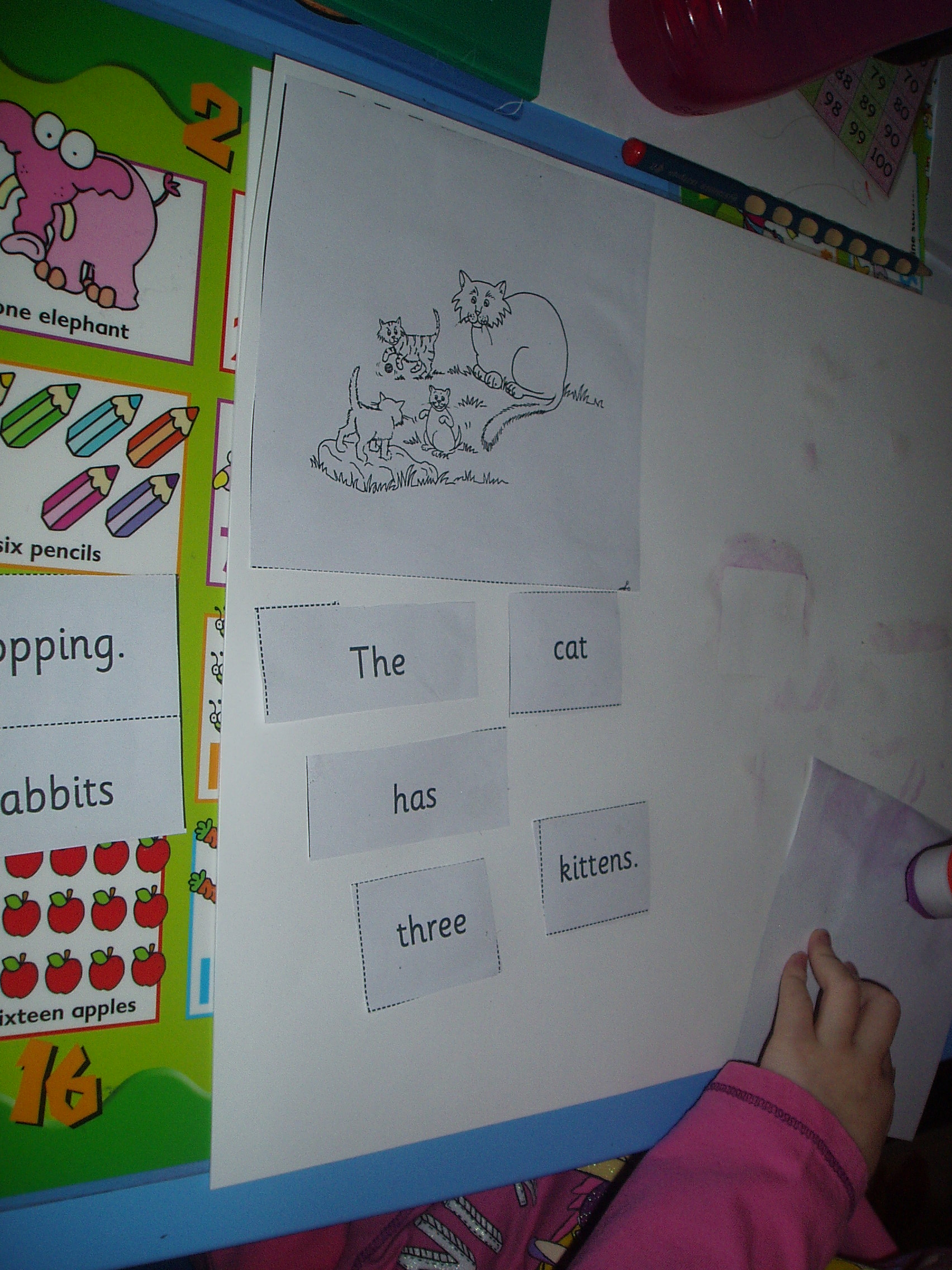 One of Pink’s favourite reading activities is when I give her worksheets where she has to cut out the words and paste them in order to make a sentence. She does not even realise that she is practicing her reading. We got a number of these great worksheets from The Phonics handbook by Sue Lloyd and The Grammar Handbook. While I am sitting here writing, she asked if her “school work” today could include some more of the worksheets we did yesterday (you know you are onto a good thing when they actually ask to do the work).