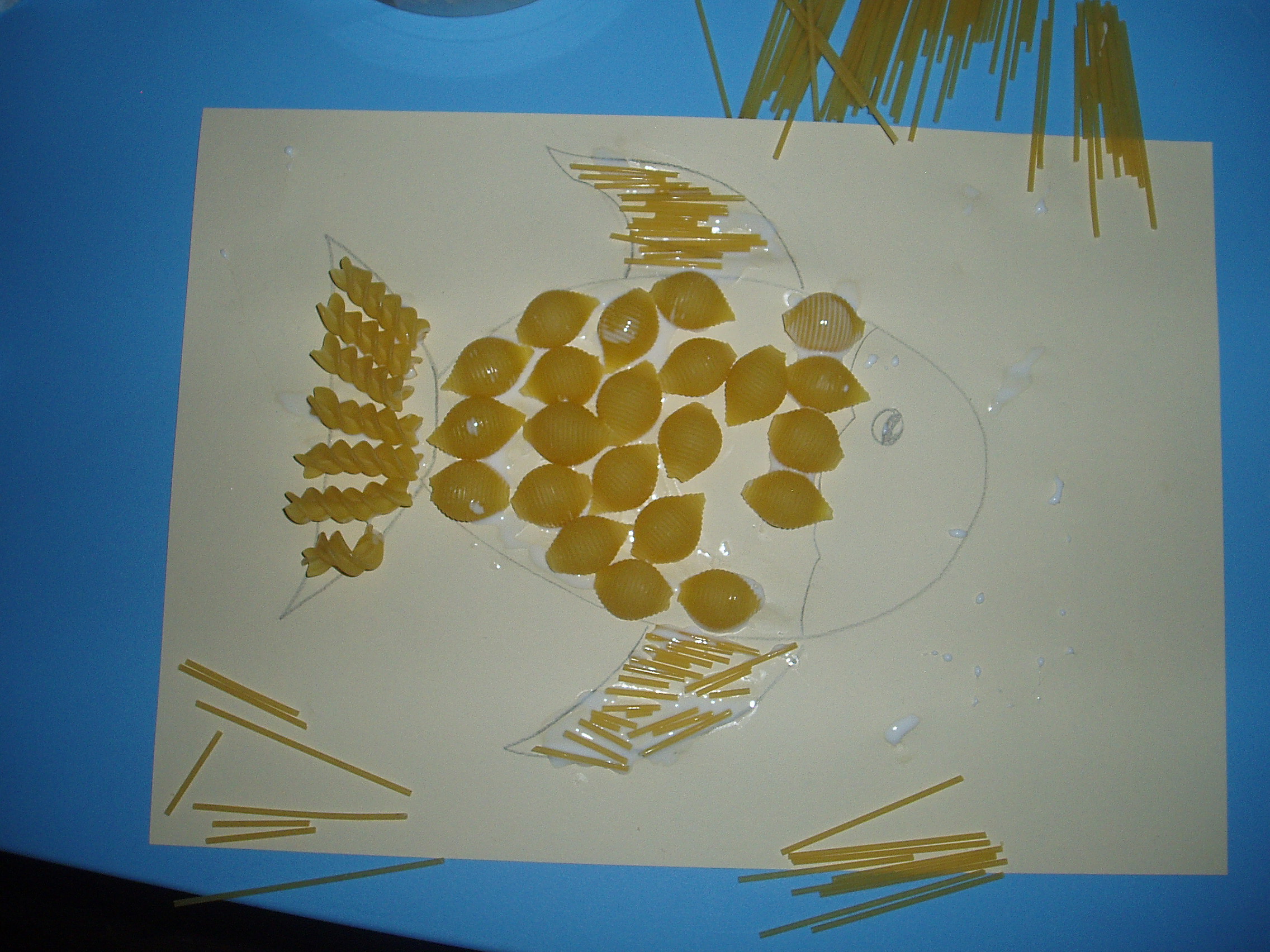 We started off by trying to do a fish with our pasta as we had been talking about the fishes scales and I thought the pasta shells would make good scales. Pink really got into it, Blue had fun even if he did go out of the lines a bit.