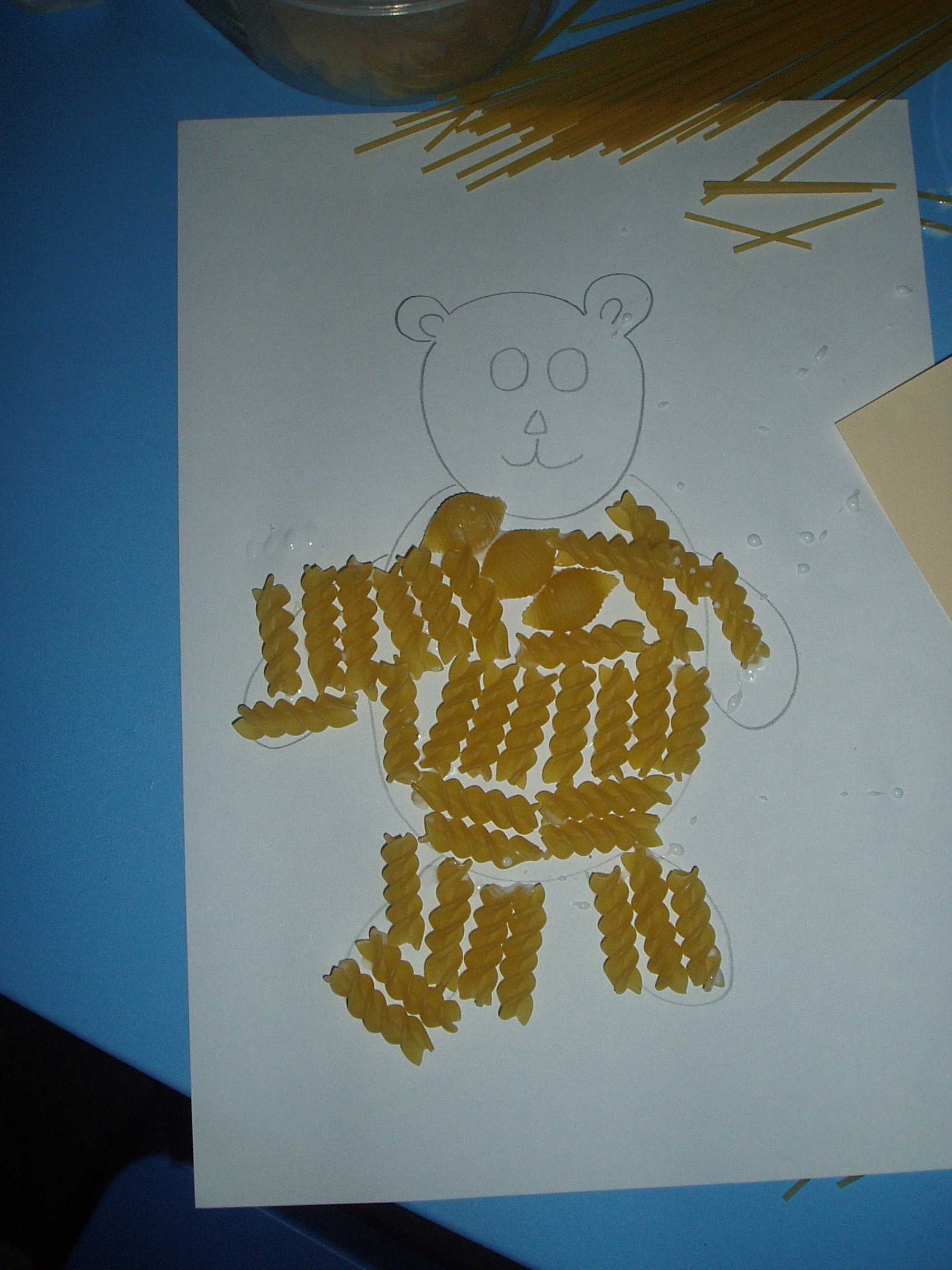 I started off by putting the glue into an old food container so that the kids had to dip the pasta shapes into the glue. This did mean that the kids ended up making a bit of a mess and got glue everywhere but that was part of the objective. After Pink finished she wanted to do a bear but asked to use the glue sticks this time.