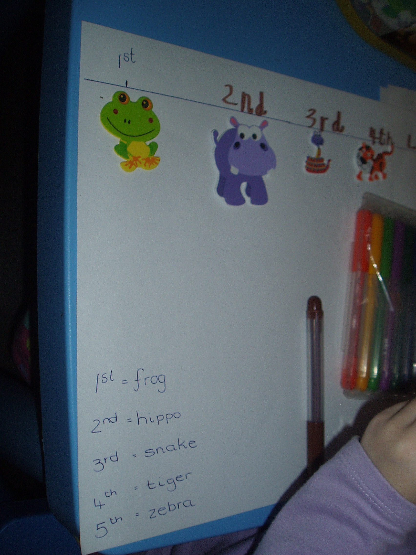 We have been learning about ordinal numbers over the last week. We started off with a simple page from Pinks Maths book – Shuters Premier Mathematics. Pink with her love of all things animals enjoyed this as she had to figure out what colour fish was where in in the line. This naturally lead to some fun playing with our toy animals placing them all in line.