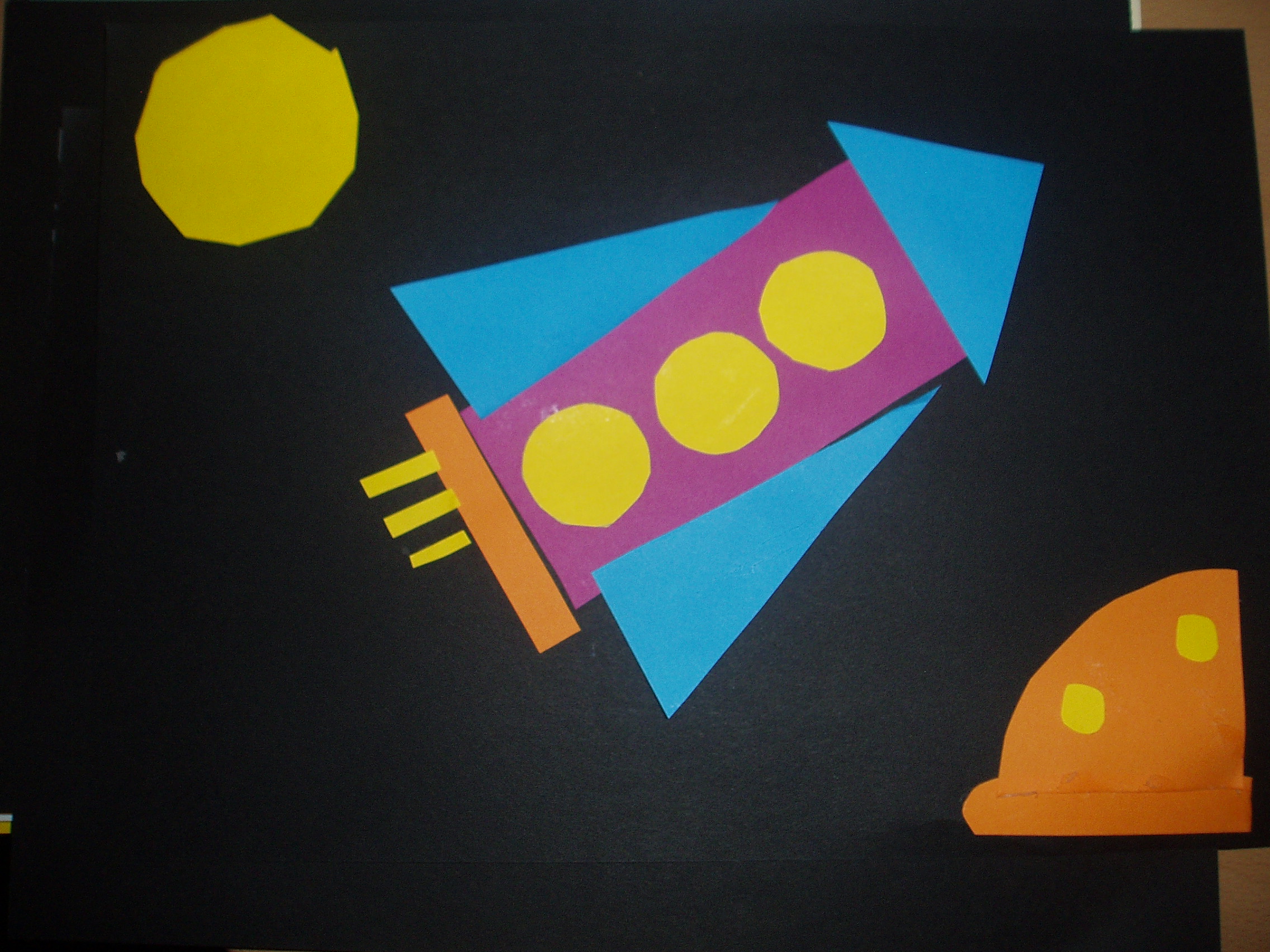 We have also done a few pictures where I cut out some shapes and the kids get to create their own pictures with the shapes, they have done houses, people and gardens but I just love this rocket.