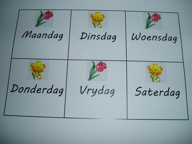 So if anyone else would like the Afrikaans cards for the Day of the week and Months they are on the 4 share account here – Afrikaans calender cards – Mei Junie.