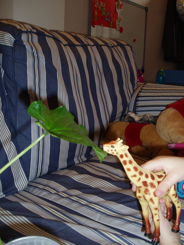 Blue who is normally a car or train book reader is really enjoying these books and is finding the animals very amusing. After reading the Giant giraffes Blue actually went and got his toy giraffe out and was helping him reach the leaves on the tree (he borrowed the bean which Pink has been growing). Had to add the photo of the giraffe – just so sweet.