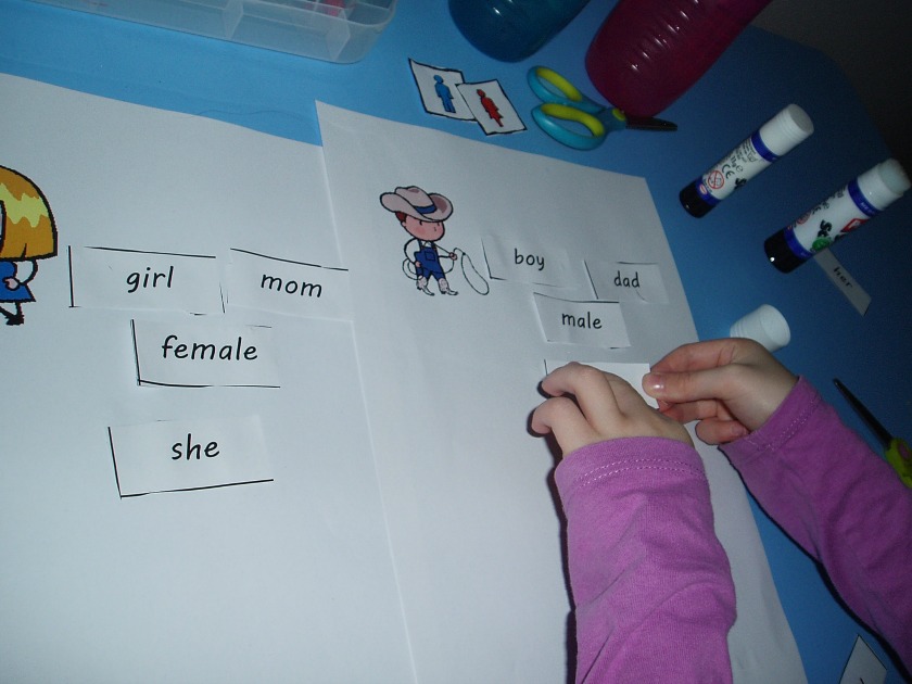 We have been doing a bit of a mix of word work lately but somehow it all seems to be coming together. Blue has is going through that stage where he thinks everyone is a HE (Pink did the same around this age she thought everyone was a SHE) so I thought I would use this as an excuse to revisit some of the male verses female words with Pink. I made this very simple printout where she had to cut out the words and stick them on the correct page – one page has a small picture of a girl and one has a small picture of a boy. Pink always enjoys doing some cutting and sticking so I knew this would be a hit. BOY Verses GIRL download.