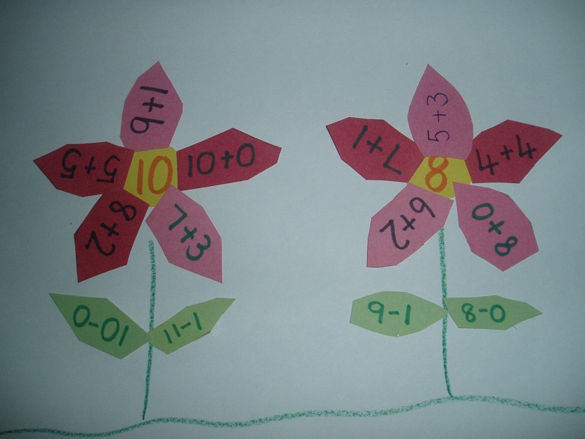 Pink loves flowers, she loves looking at flowers and she loves doing activities with flowers. We have done a number of flower crafts before, and we used flowers when we where learning about sh, ch and th (she loved that) so I thought I would try something similar to that activity but using maths. (post re sh, ch, th flowers).