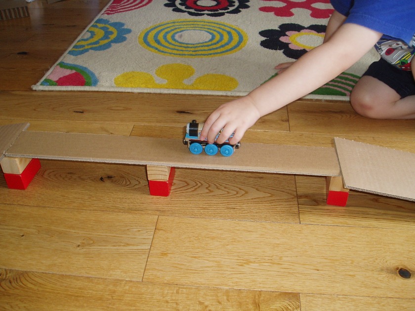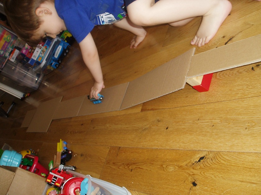 Over the weekend we had some IKEA furniture which we where assembling so Blue got some cardboard and built himself a train track, no-one helped he figured it out himself, wooden blocks and all.