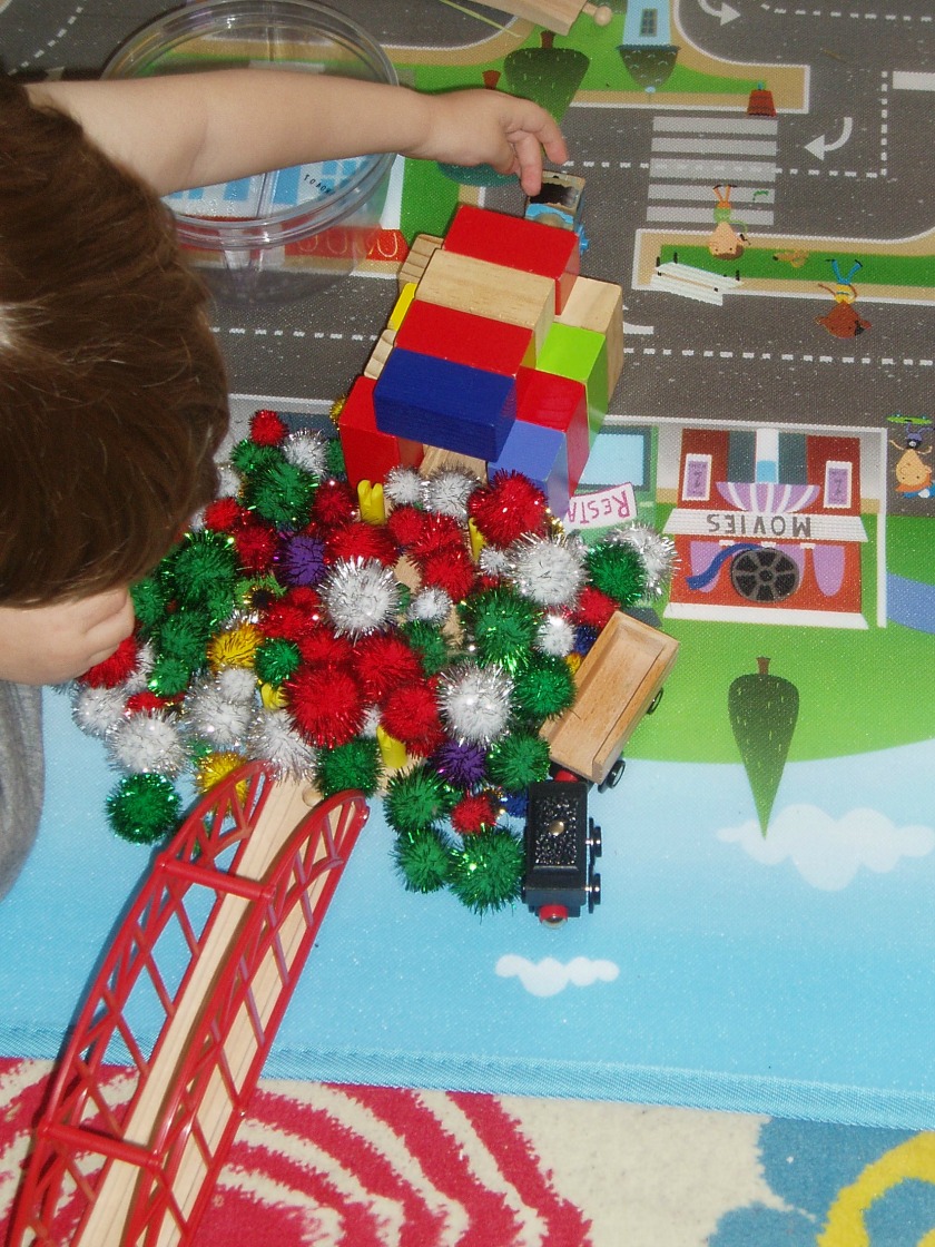 OLYMPUS DIGITAL CAMERAI love that the kids integrate their toys, they are forever using some of the craft supplies in their games – notice the pom poms where being used as rocks blocking the track