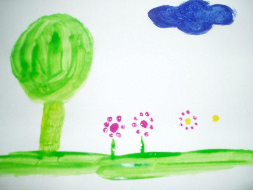 She really enjoyed this and naturally once we had finished this great activity we used our paint to make some pictures. We recently read about Claude Monet and Pink loved his paintings so she is know determined to paint using dots – I really loved the little flowers below.