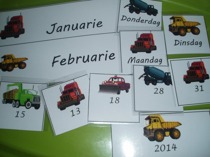 Blue has been asking me for some Truck cards so he can join in with Pink when she does her “school work” so I made him these Truck calender cards. He has been using the date cards (numbers 1- 31) to make a timeline and loves them. I am really not fussed if he gets it wrong I just wanted to encourage his desire to join in with Pink when she does her learning activities. Pink also liked the date cards so I made her some calender cards in Afrikaans to go with.