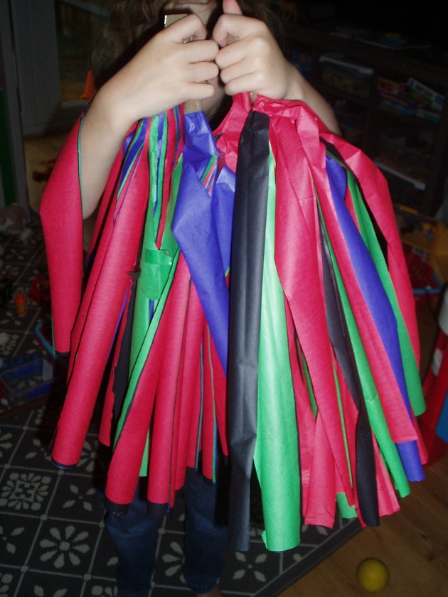 So after having her ask me yet once again ” when is dance class starting ?” and having to say she still has a few weeks of waiting left I thought I would try and do something dance related for her. Just before the summer holidays they where using cheerleaders Pom Poms in dance class (she loved them) so I thought I would make her some. I had some rolls of thick tissue paper in the house so I used those hence the multicoloured Pom Poms.