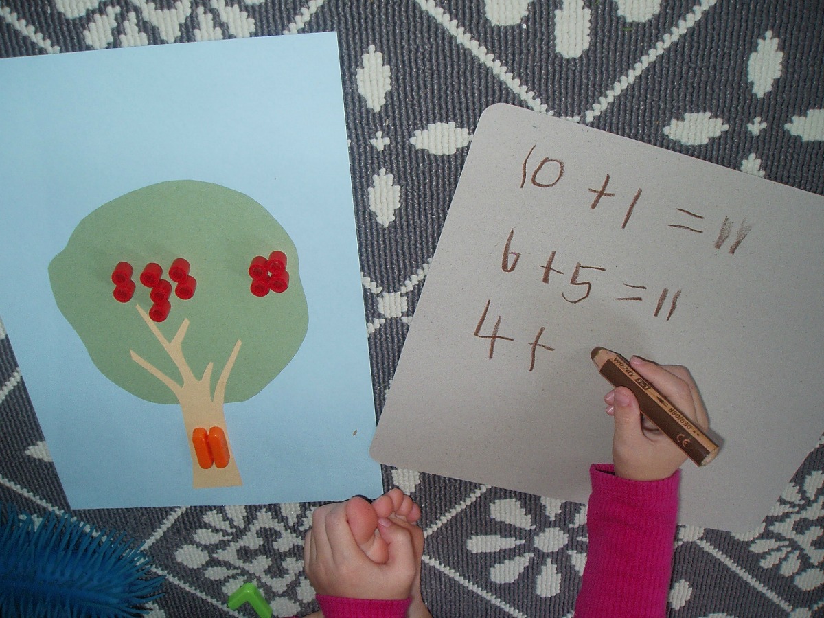 With Pink we used the tree to practice some number bonds. She would choose a number place it on the tree trunk and add the correct number of apples to the tree. Then we would look at different ways for the apples to be grouped so we could make up the total.