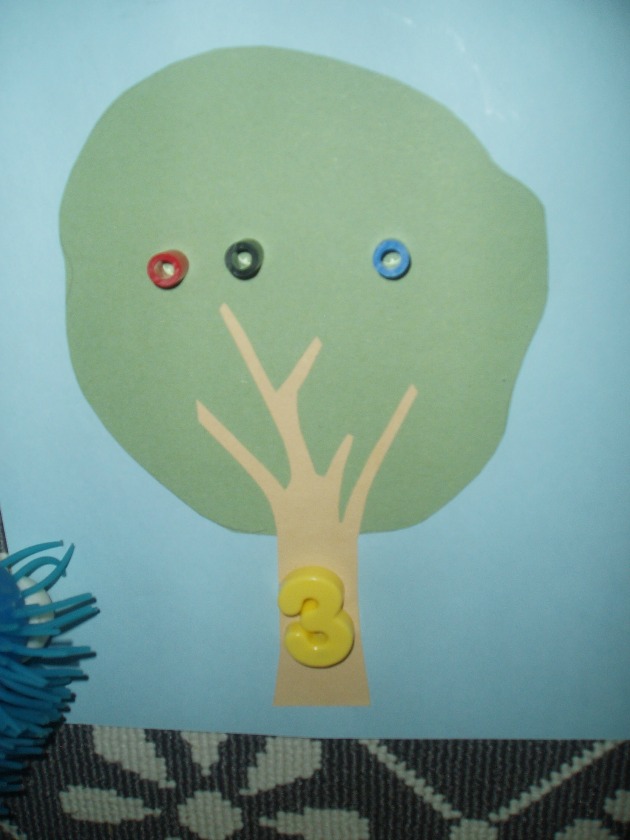 Blue is still learning his number so he choose a number, put the number on the tree trunk and then he had to add the correct number of apples to his tree (beads from the tub). Blue liked having multicoloured apples.
