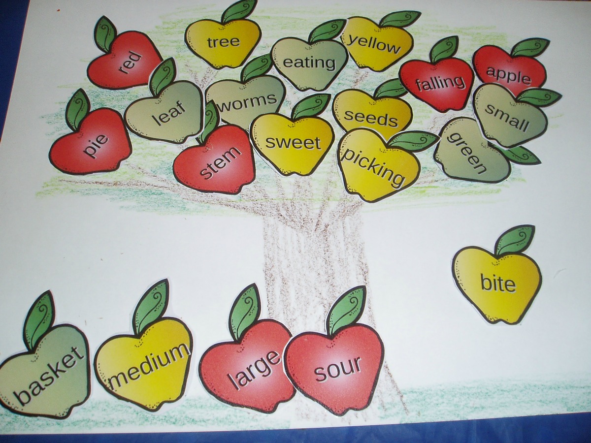 I drew a tree for Pink and then she stuck the apples with the words that she knew onto the branches. The apples are from a free apple language pack done by Cassie on 3 Dinosaurs.