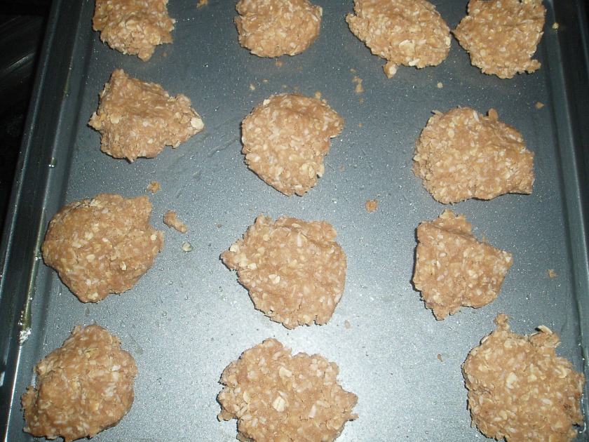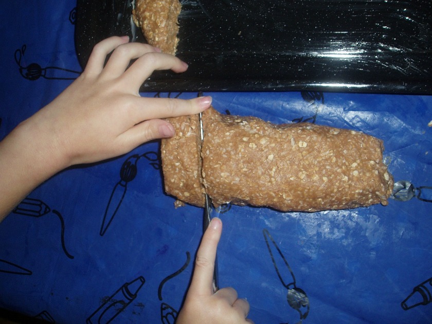 Roll into soft balls, place them on a greased baking tray and flattened with a fork. We actually rolled our mixture into a sausage and Pink used a knife to cut it into rings