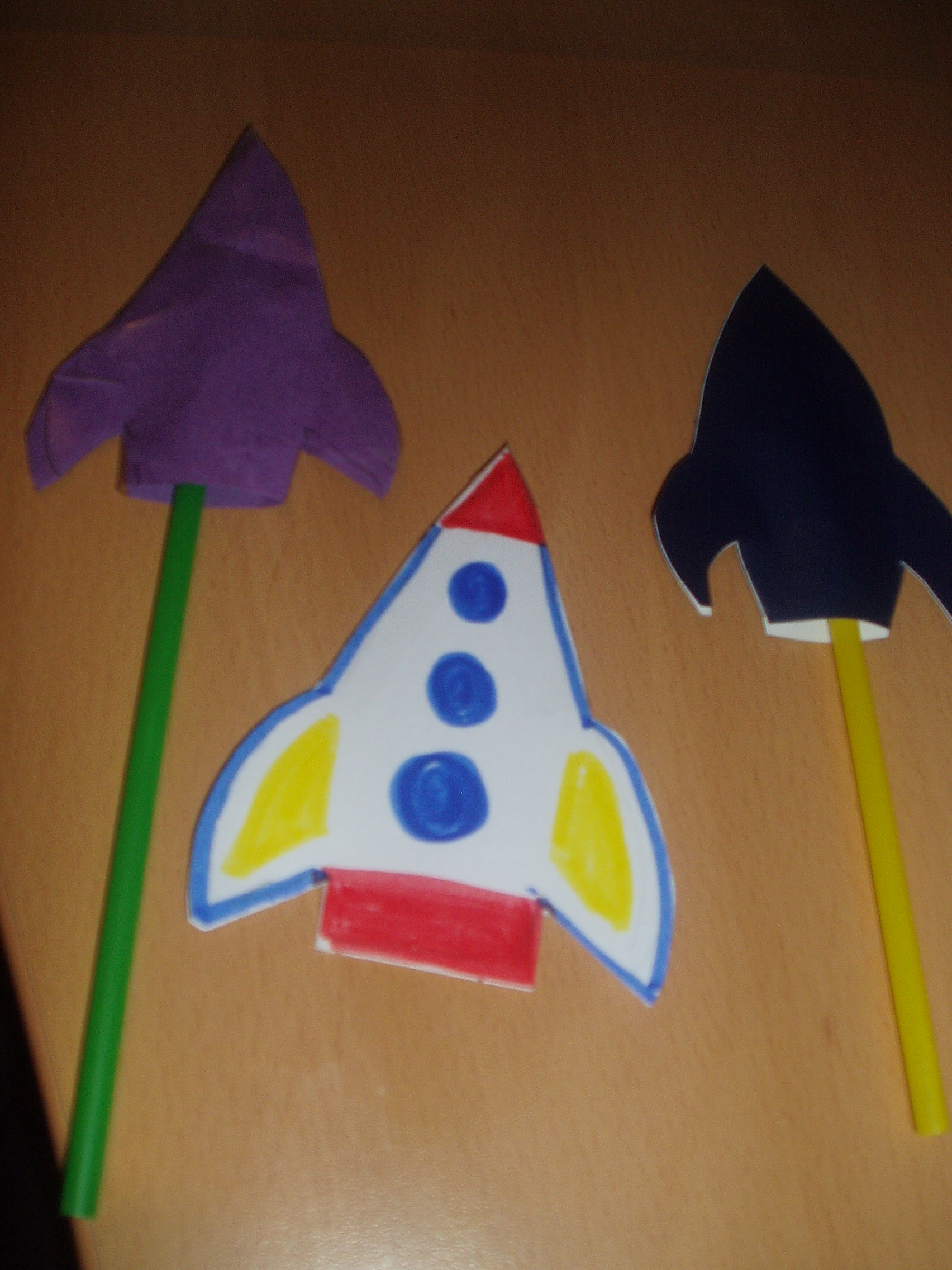 You need to trace the identical shape onto two pieces of paper (or just fold your paper) and cut and stick the sides together. You can use paper and glue for this but I must admit I found that they worked better if we used some scotch tape around the edges (you need to make sure that the edges are properly sealed). Leave a gap at the bottom of the rocket for the straw to fit in and you are all set. After making a bunch of these in different shapes Pink learnt that the bigger ones do not work as nicely and the gap for the straw must not be too big either.