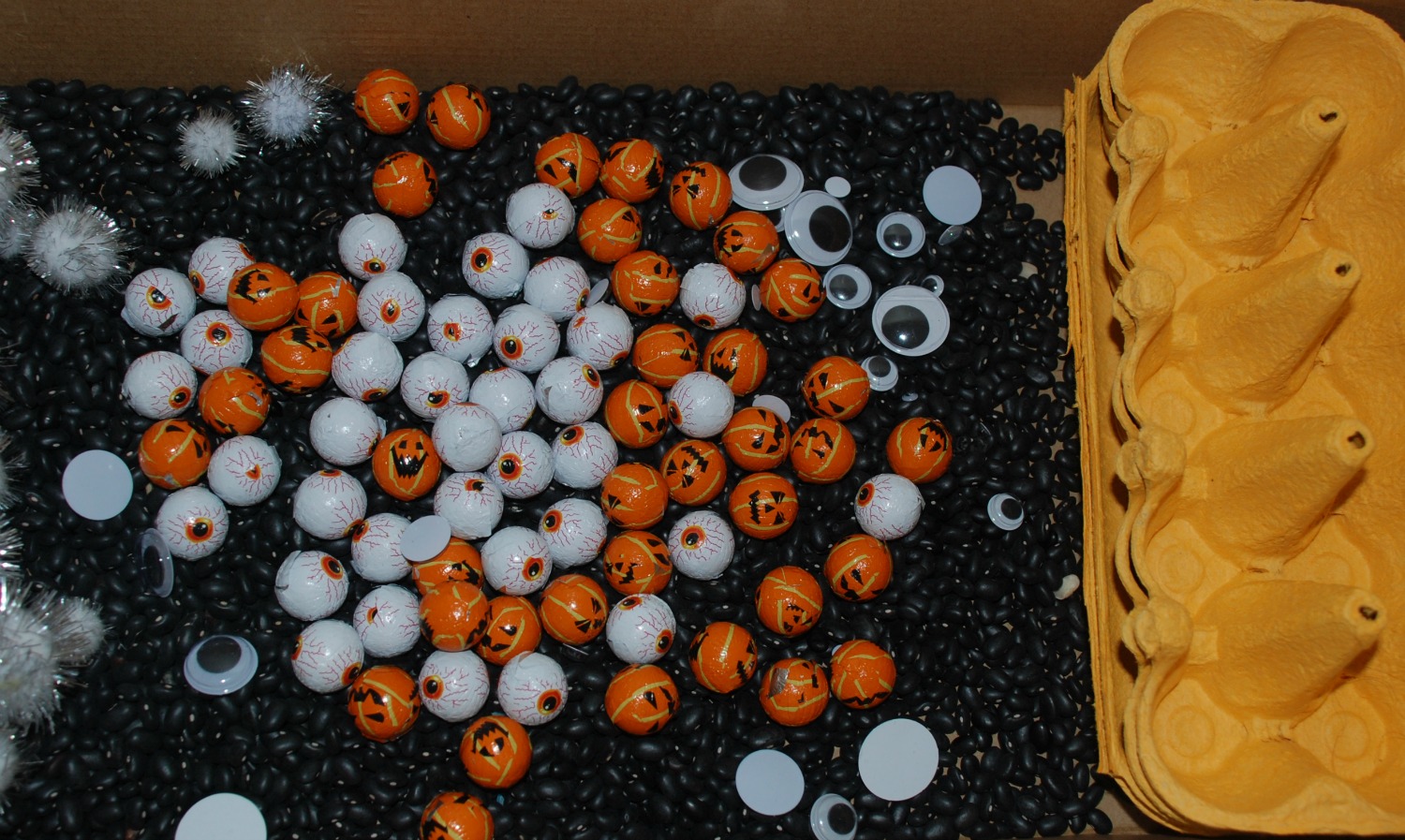 The second was some of our black beans with some pumpkin and eyeball chocolates and 2 empty egg cartoons.