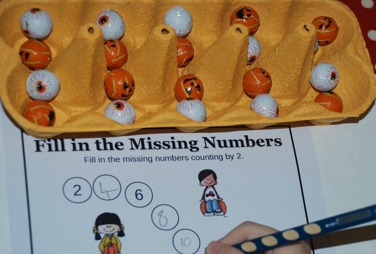 The idea being that Blue could practice using the tweezers to put the eyeballs into the egg cartoon and Pink could practice her counting in 2’s by placing 2 mini chocolates (1 pumpkin and 1 eyeball) into each egg cartoon. And she completed the counting in 2’s page which is part of the 3 Dinosaur Pumpking pack Maths update pack (see link below). This really was a fun way to revise her counting in 2’s (need to think of something similar for her counting in 5’s revision).