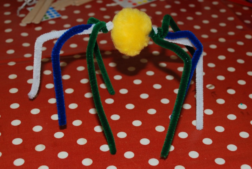 We inserted one long pipe cleaner through the pom pom which gave the spider one leg on either side.