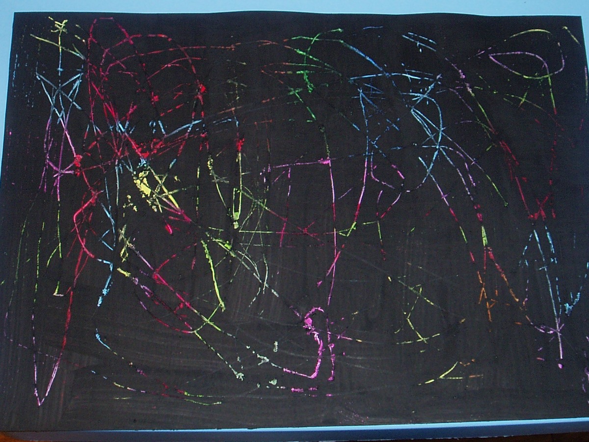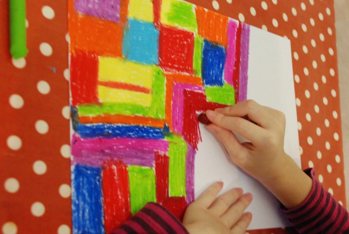 We started off by creating blocks of colour with our oil pastels. With younger kids I would suggest going over and making sure there is no white sticking through.