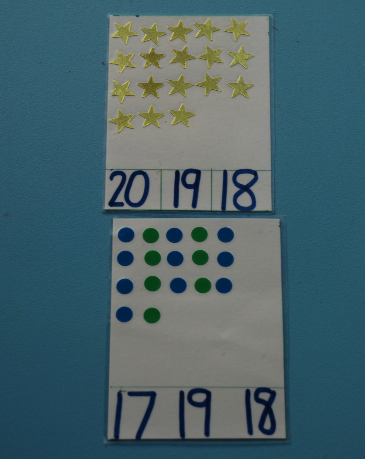 So I thought it would be fun to make our own number peg cards. I did this with his big sister about 2.5 years ago when she kept getting stuck with the numbers around 20. We used the scrap card in the house and some stickers to make her number cards. She loved the fact that the stickers were raised off the paper so she could feel them. We ended up laminating most of the cards that we made. I managed to find some of the original ones that Pink and I made (very basic but it did the trick).