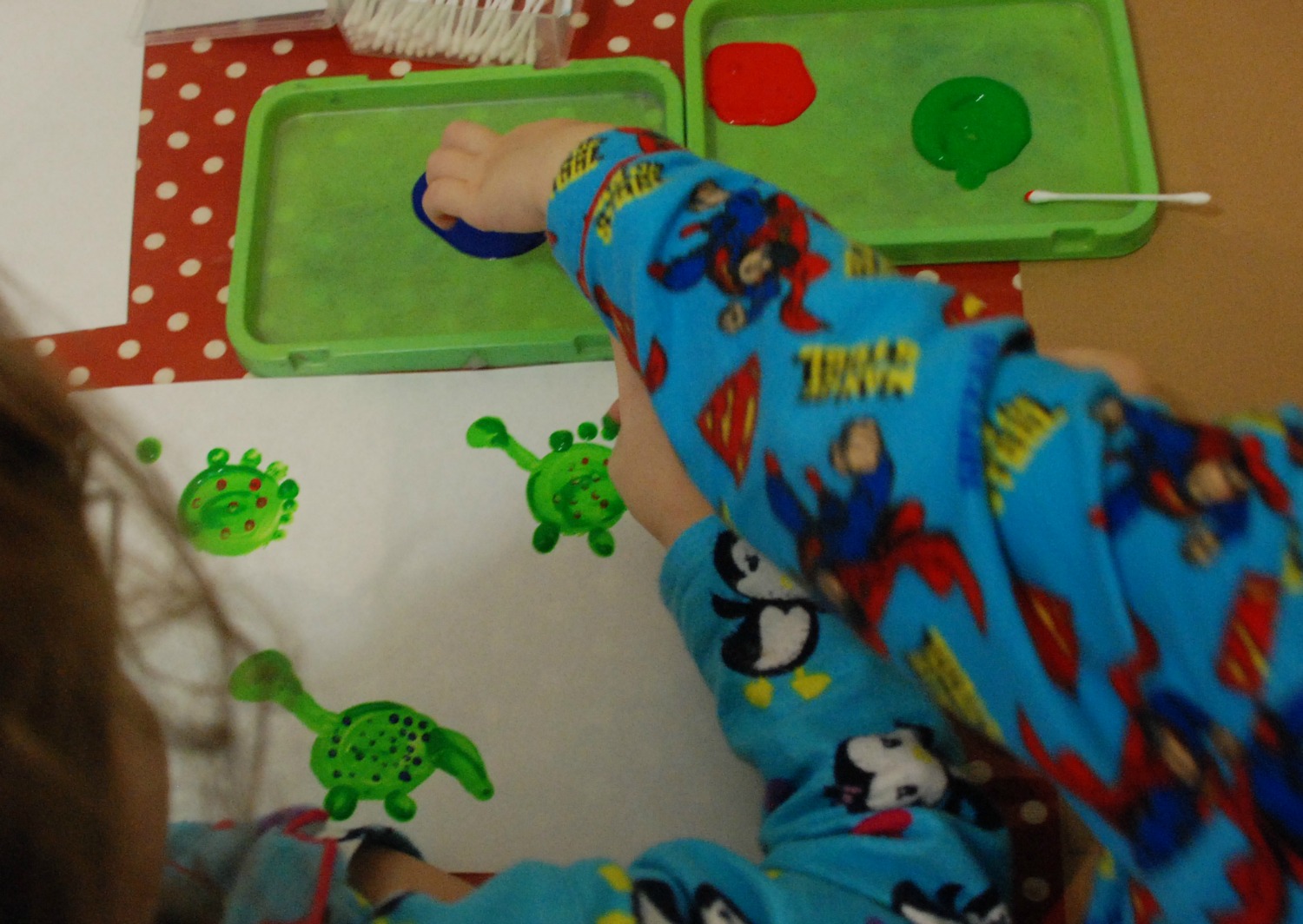 Once it had dries we used a different colour to add some details (for some of the smaller details the kids did use some ear buds). And yes the kids are painting in their PJ’s (my son was not feeling well).
