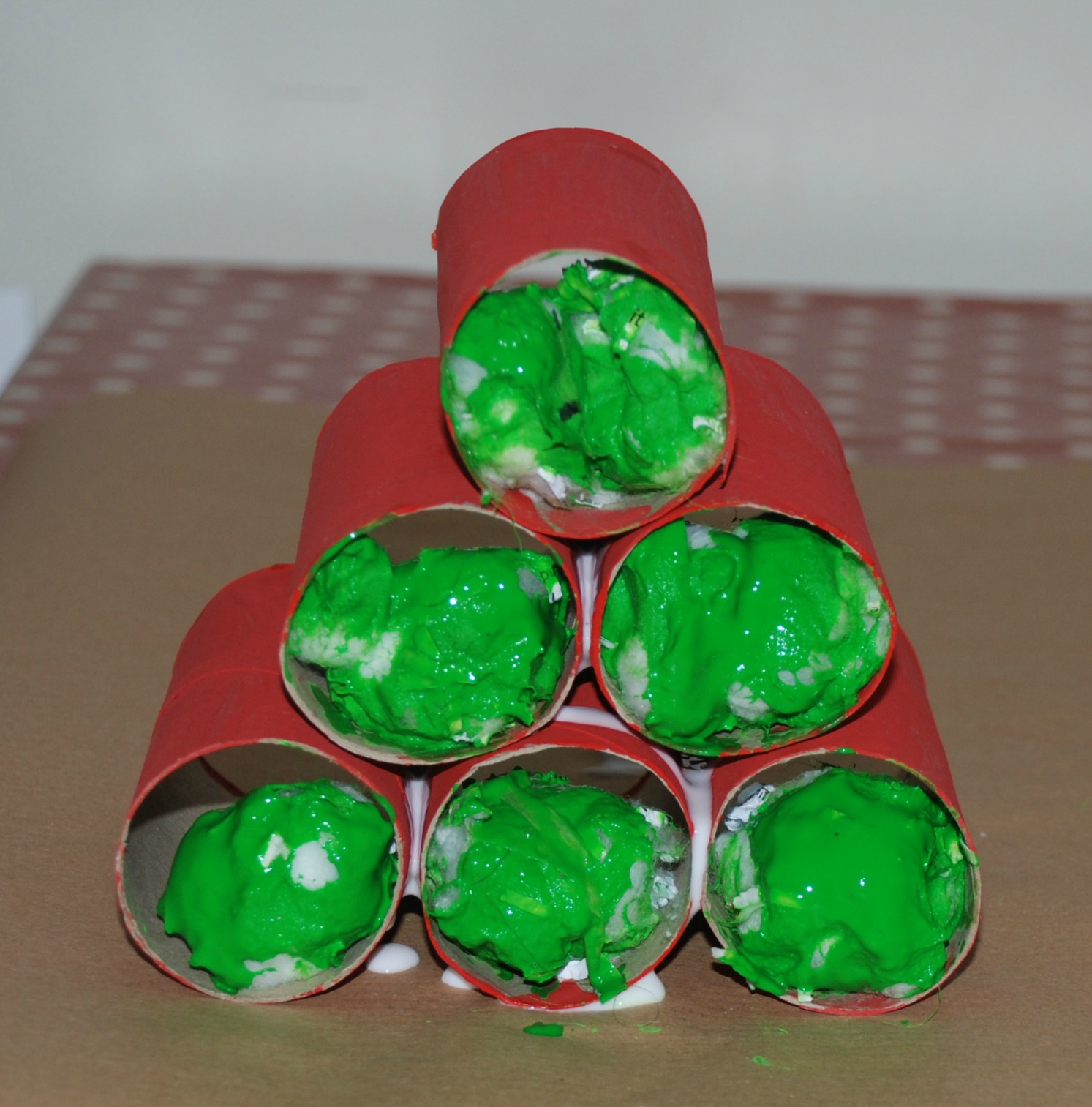 What else to do with painted toilet rolls. I have seen the idea of stacking the toilet rolls to make a Christmas tree in a couple of places so I thought we would give it a go but my daughter did not think it looked quiet right – she wanted to add something inside the toilet rolls. So we ended up getting some cotton wool balls, dipped them in green paint and added those. This did get very messy and my daughter did not totally finish doing it – you can see some of the toilet rolls need more cotton wool balls added – I have left it on the kitchen table and I am hoping that she might come back and finish it herself.