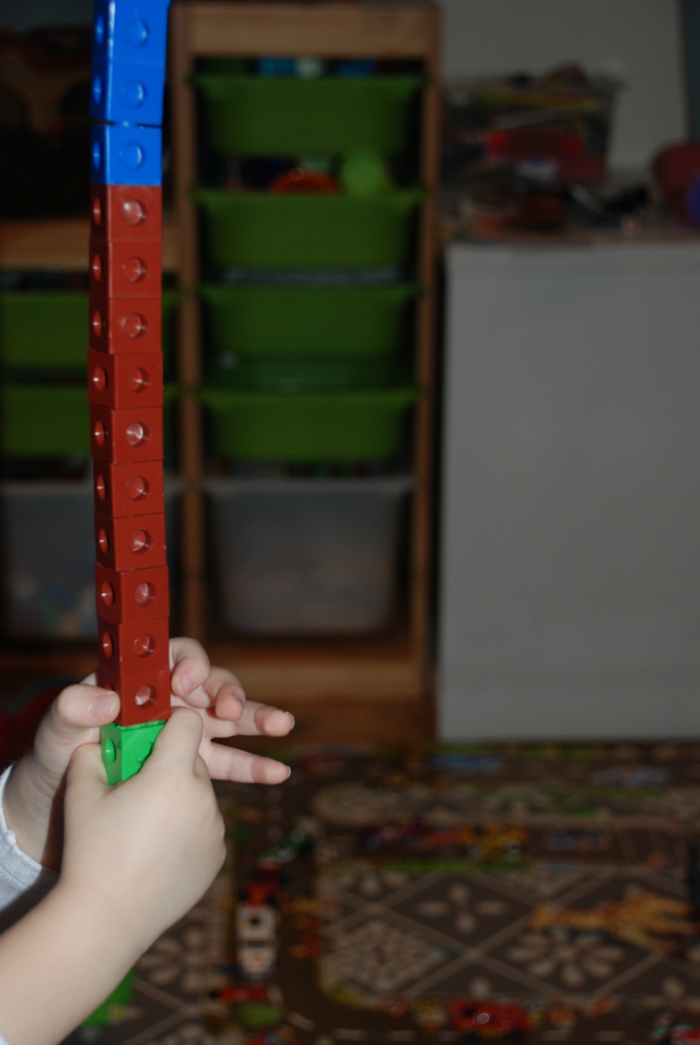 My daughter has been using the snap cubes a lot lately while we work on her bigger numbers. In fact today they provided the lightbulb moment. She has been trying to add 3 numbers together but gets a bit stuck, today while using the snap cubes it just all clicked into place. 5+5+2 =12. Once she had figured that out she started adding different sums with 3 numbers in her head.