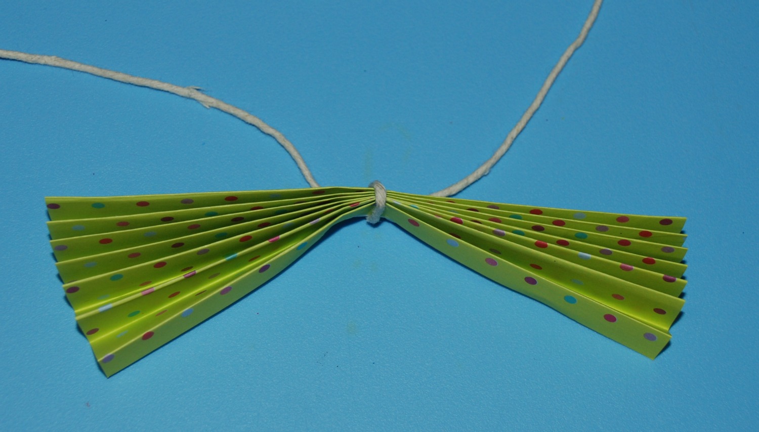 Now tie some string in the middle. I found it looks very effective if you add some small buttons onto the string (my daughter likes adding pom poms)