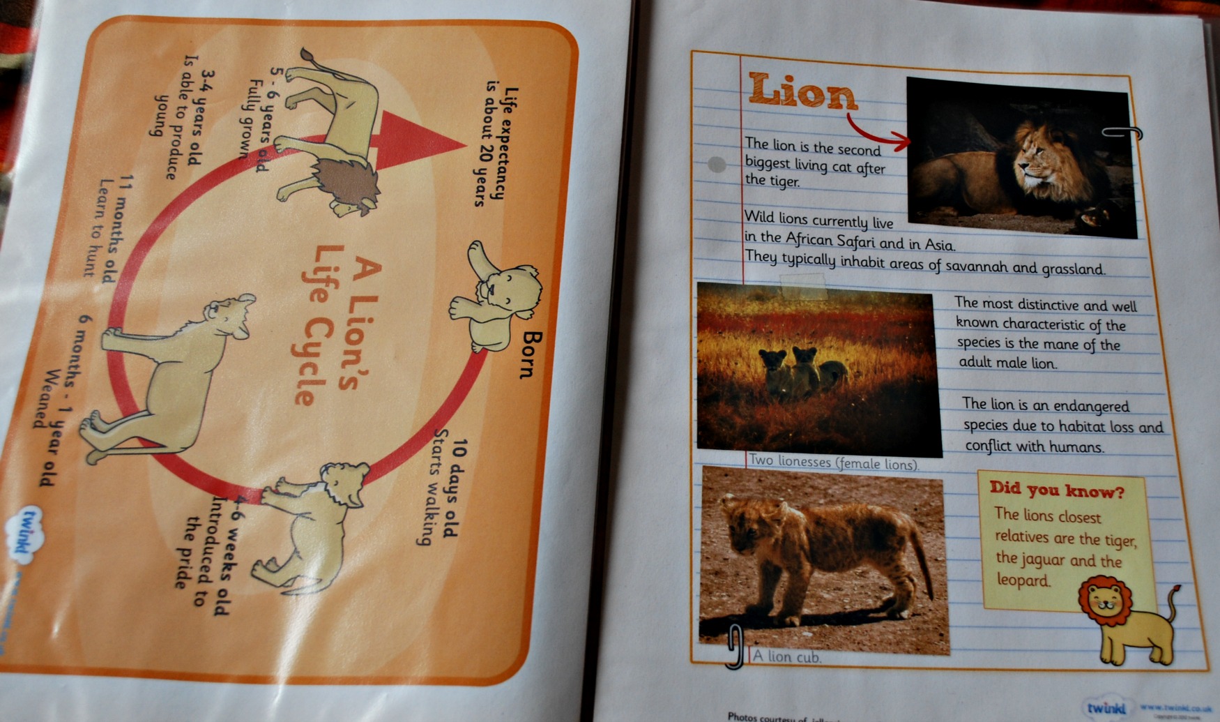 We slotted the pages into plastic A4 sleeves and then tied them together with some ribbon. We also included the lion life cycle page in our little book.