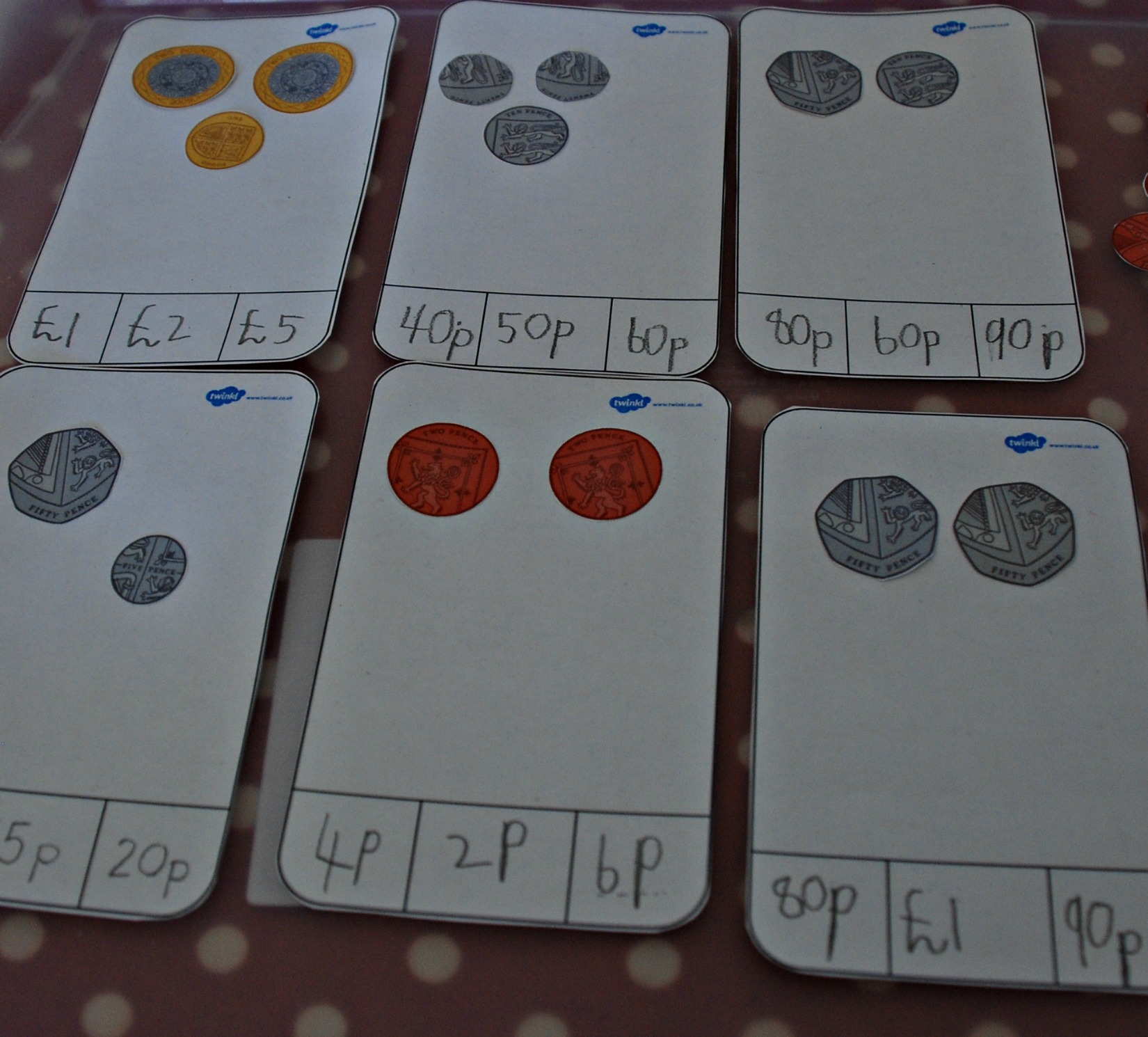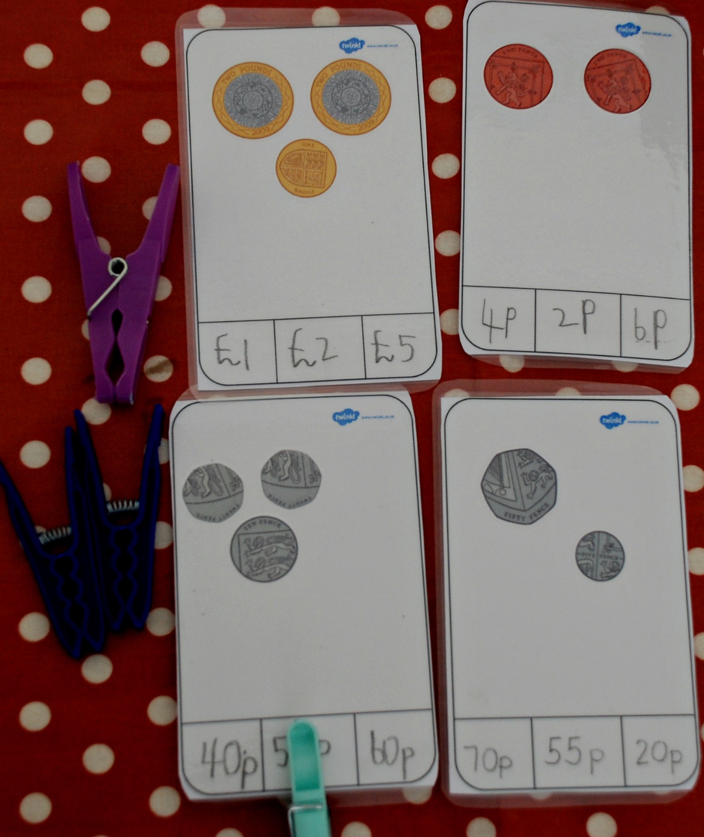 We used the blank peg card template which is FREE from Twinkl (we used this same template when we made our number peg cards) and the British money cut-outs (gold from Twinkl). I did the cutting out before hand as I wanted my daughter to focus on doing the money calculations.