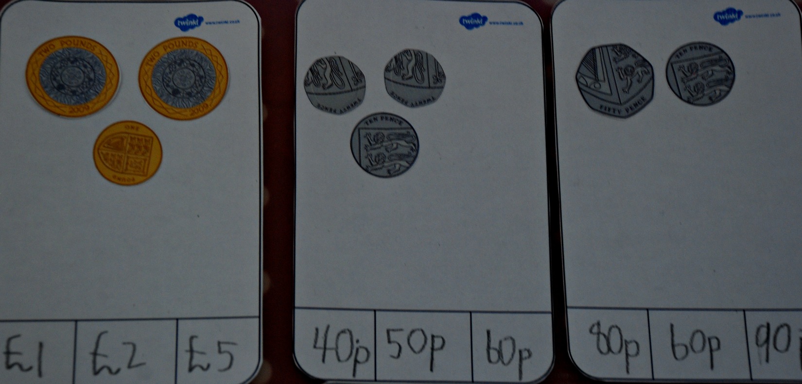 My daughter selected the coins and glued them onto the template then she worked out what the correct answer would be, she wrote that in one of the blocks at the bottom and then wrote two other incorrect answers in the other two blocks.