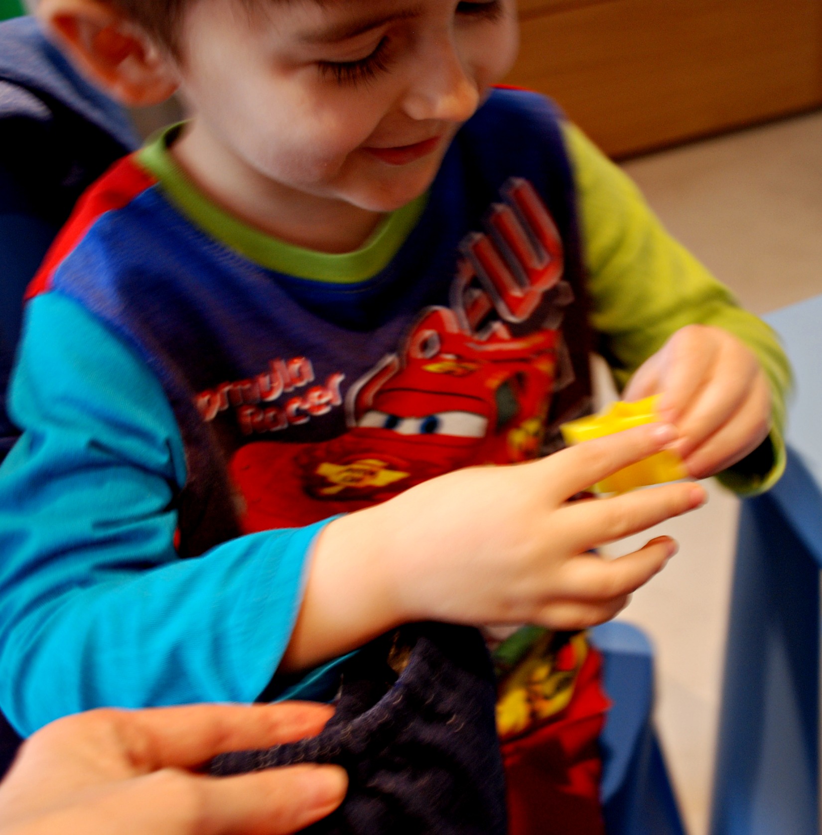 We started off by hiding some plastic shapes in a small denim bag that we have (you could also use a pillow case).