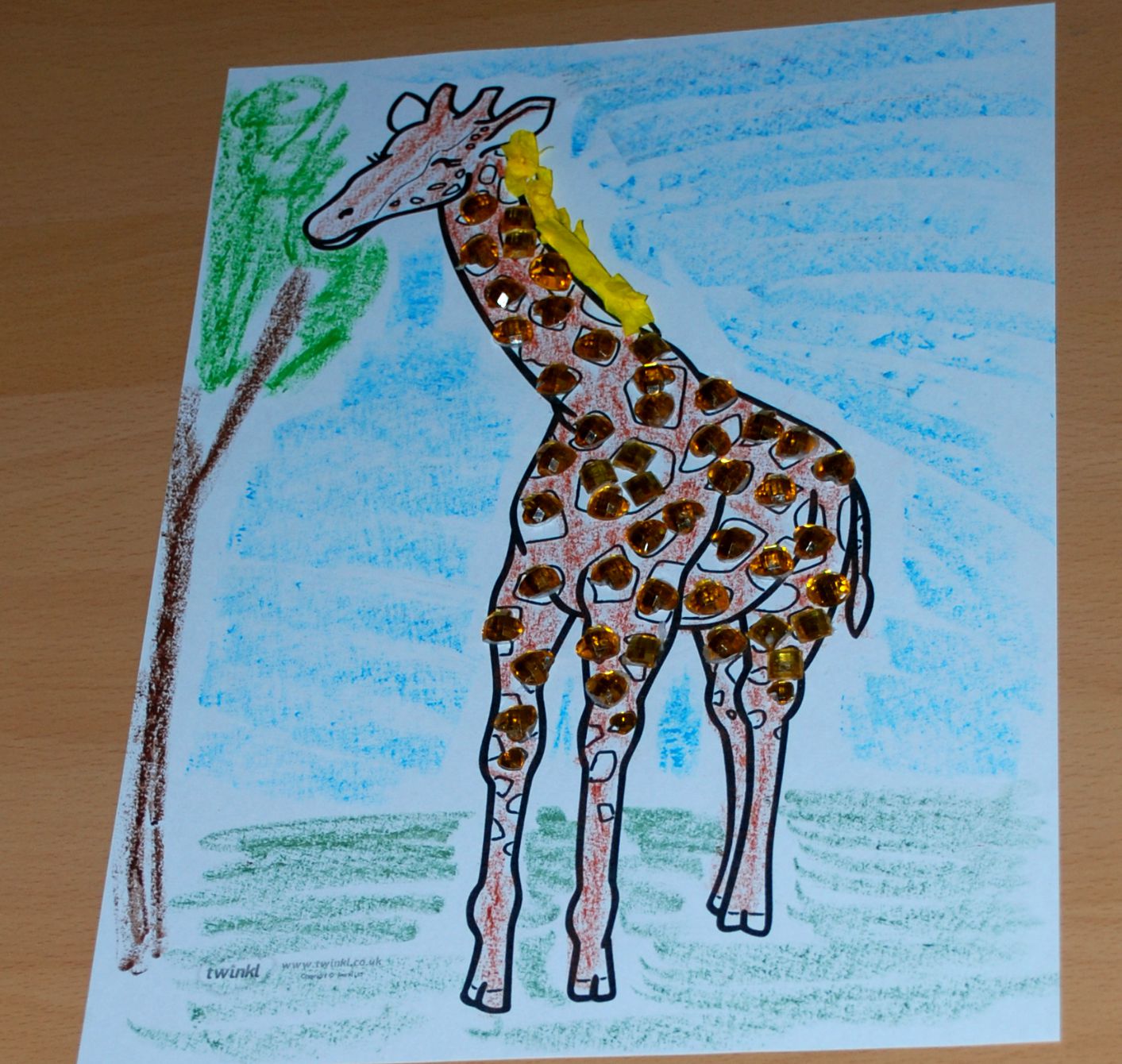 And the giraffe. Again our trusty oil pastels and this time some craft gems.