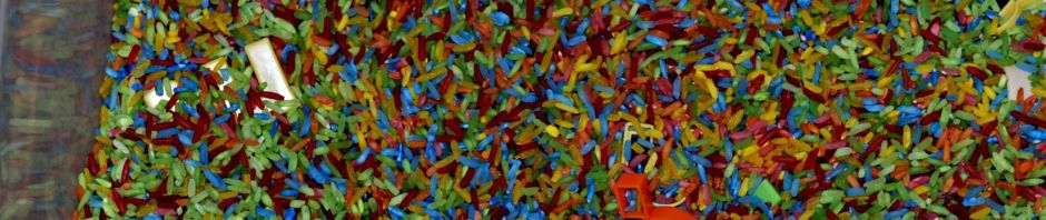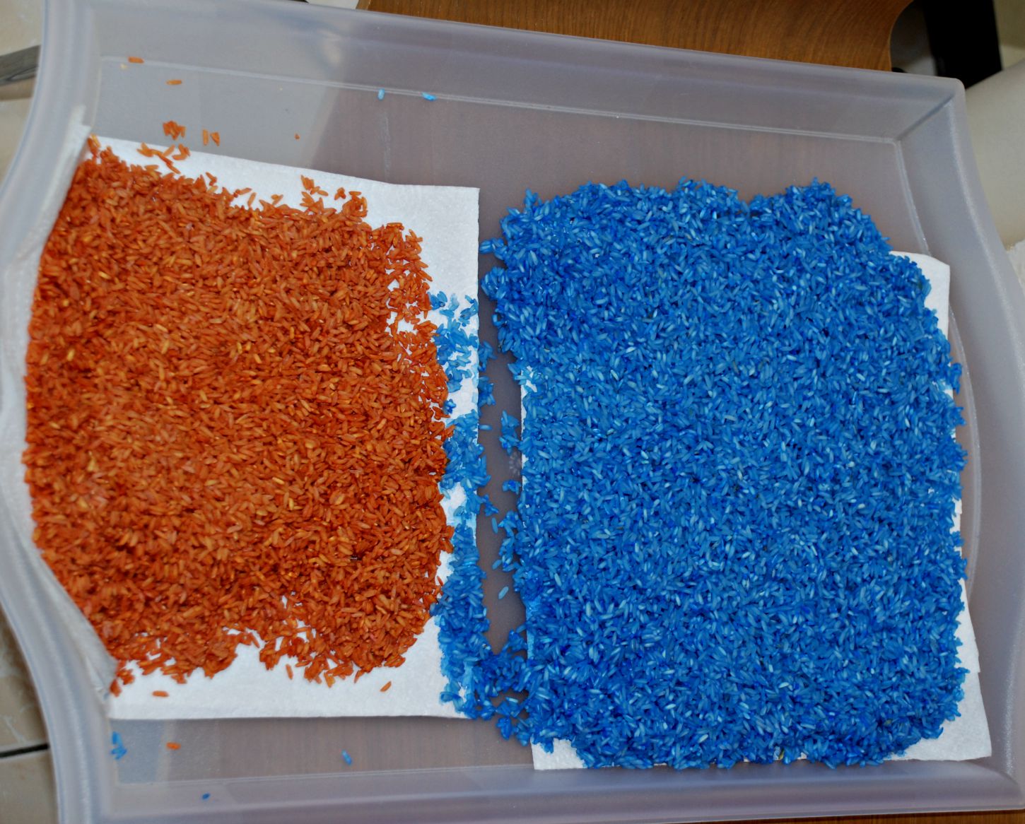 I did a number of different colours and the kids even helped me mix the food colouring to make the orange rice
