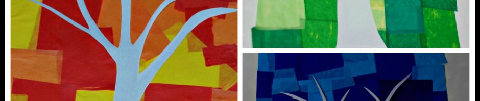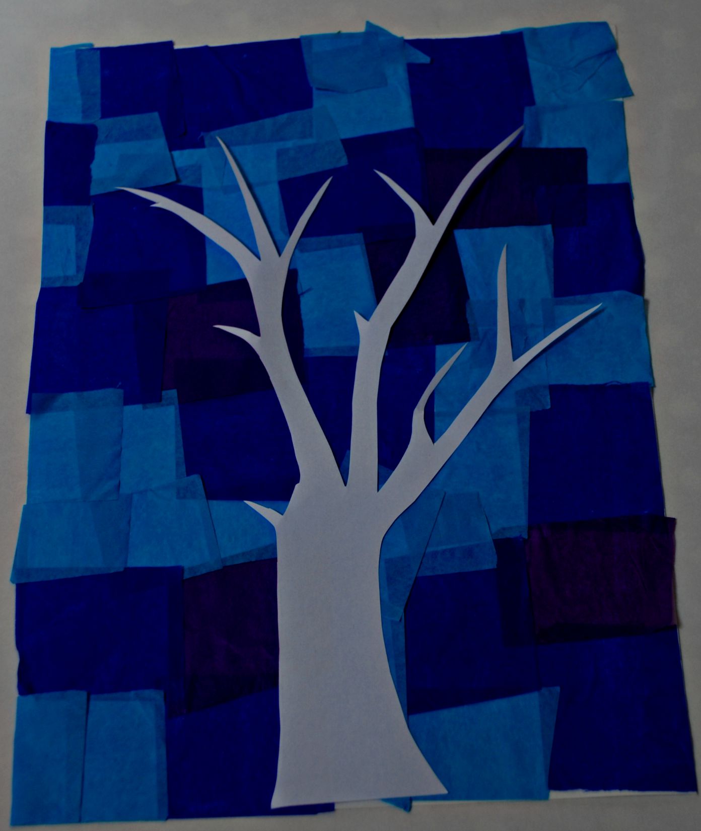 I actually love this and it makes me think of winter. In fact I think this idea would be great to do for all four seasons. You could use a tree stencil for all seasons and just change the background tissue paper colours. So Autumn would be red, orange, yellow, maybe some brown if you had any. Winter would be blues, maybe some purple, possibly grey. Spring could be pastel shades, light pink, peachy and Summer could be bright green.