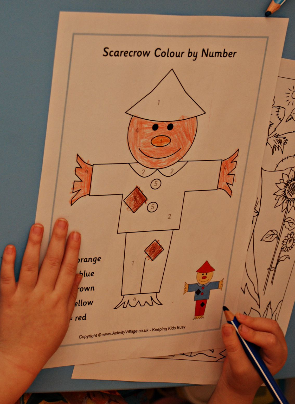As so as often happens in our house little brother wanted to join in but the scarecrow page that his sister was doing was a bit too detailed for him. I managed to find this Scarecrow colour by number for him. Although for some reason he is determined that the scarecrow needs to be a peachy colour and not yellow.