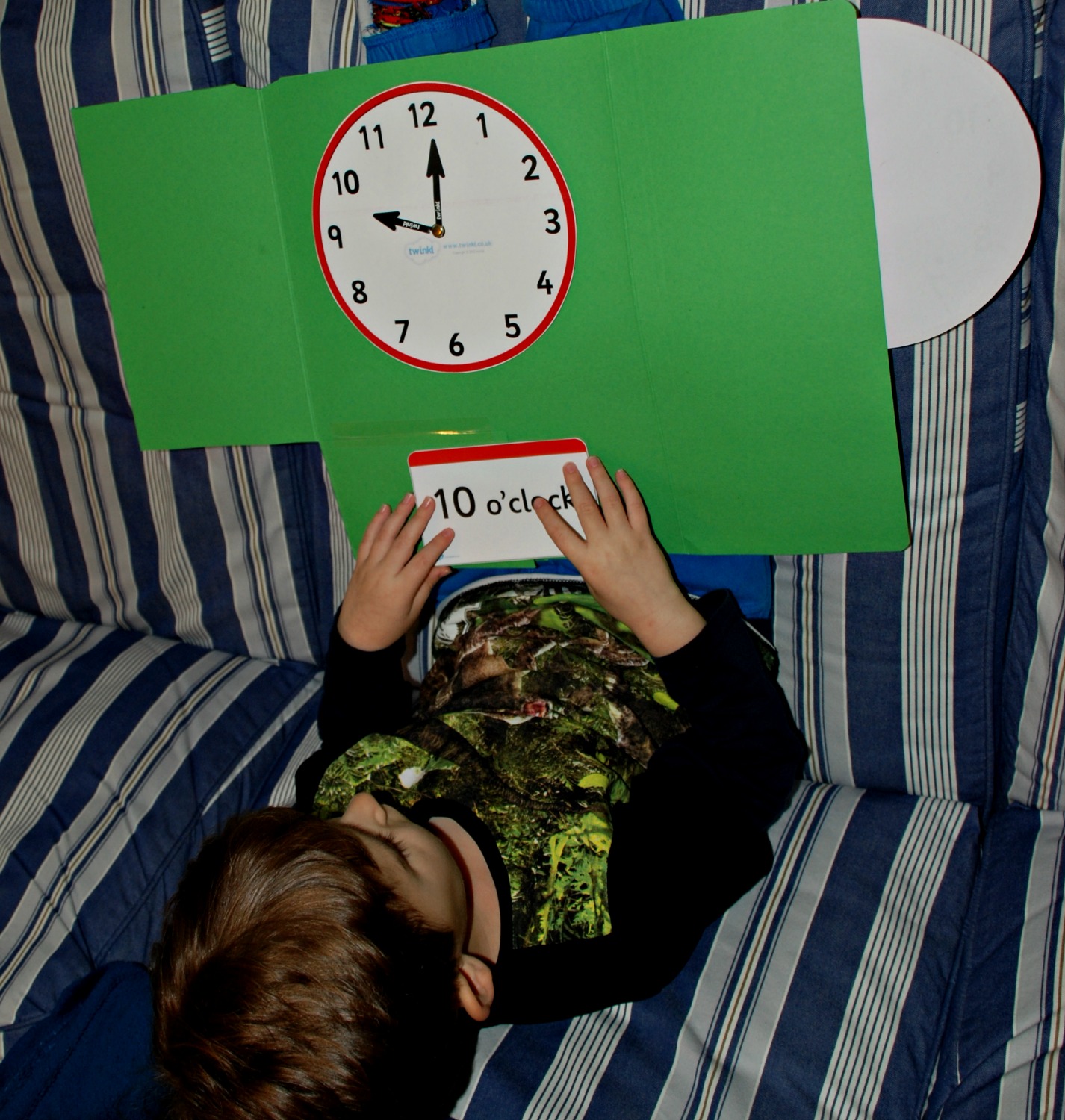 He also asked for a clock face where he could practice drawing the hands. So on the cover of his folder I attached the exact same clock face, but this time I laminated it and I excluded the clock hands. He can now use his white board marker pens to practice drawing in the correct positions of the hands to match his cards.