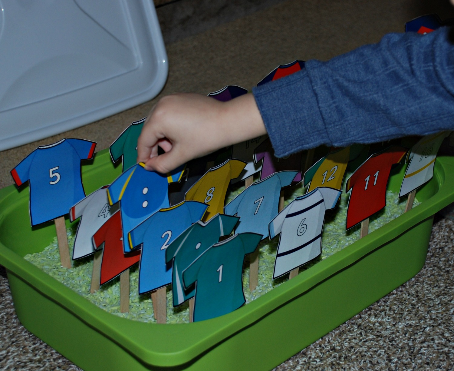 I printed the Rugby Tops on card, cut them and stuck each jersey (or shirt) onto a craft stick with some tape. We started off by just matching the Rugby tops with the numbers to the Rugby tops with the dots on (I really like that the dots have been grouped into 5’s).