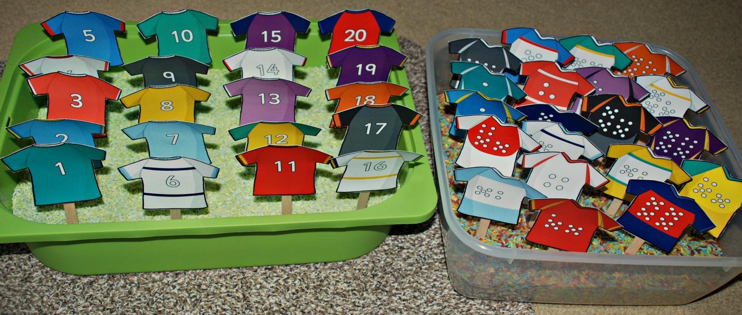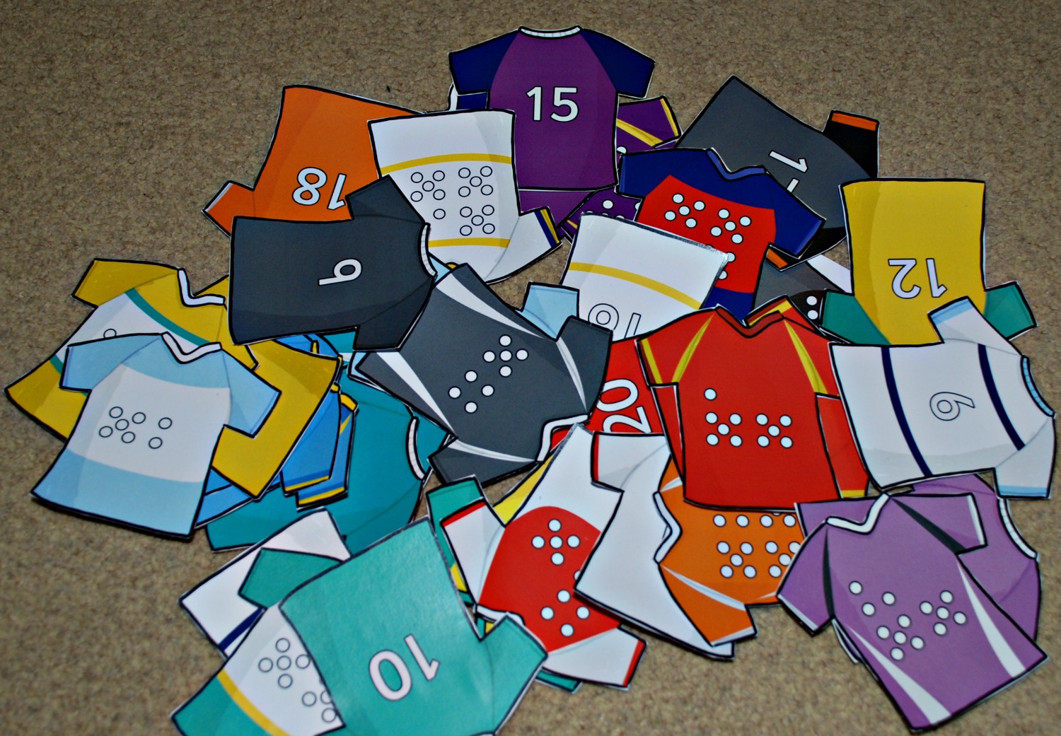 I had spotted these Rugby jersey’s on Twinkl (Platinum ) and I liked the look of them. They have a jersey for each number from 1 to 20 and they have a matching jersey for each number with the corresponding number of dots on them.