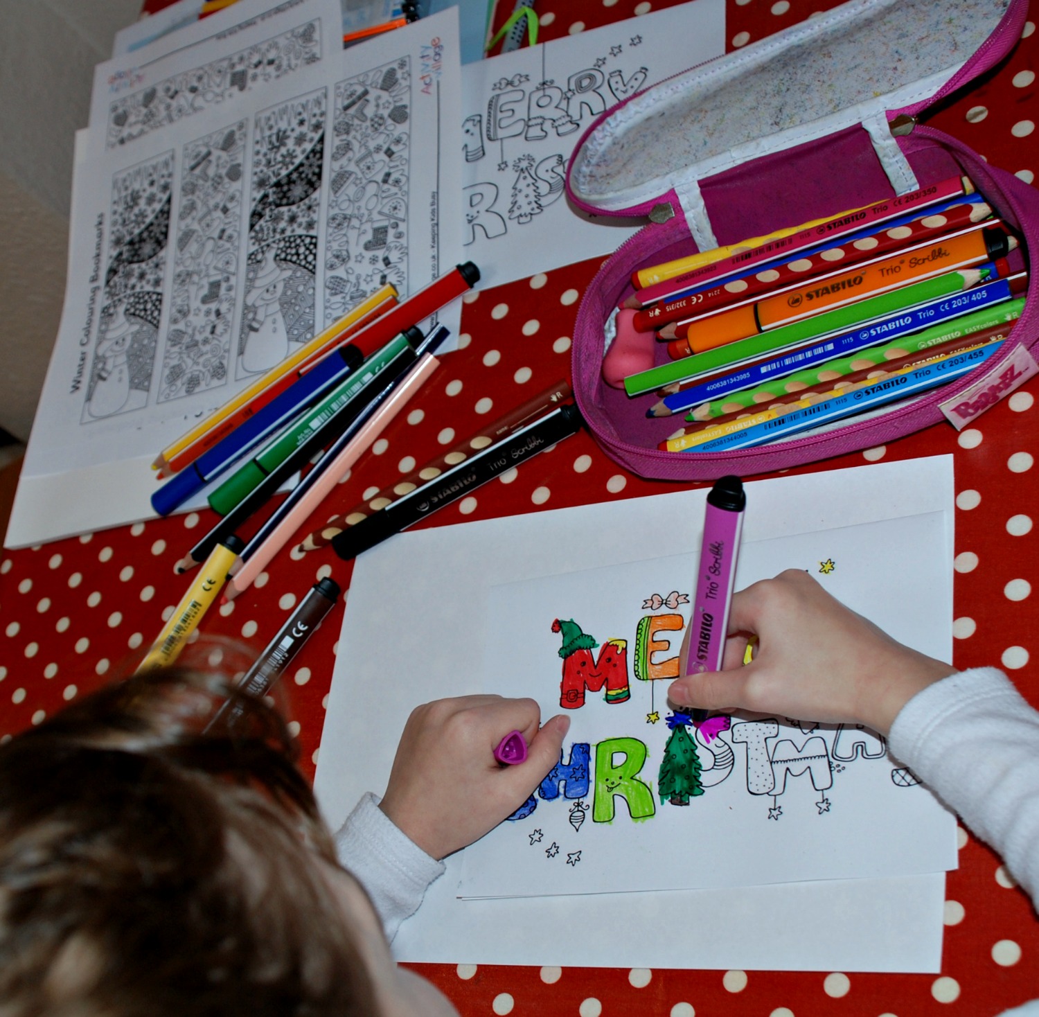 My daughter started with this lovely colouring Christmas card from Activity village (the homeschooling mom in me loves the fact that the kids are colouring in words).