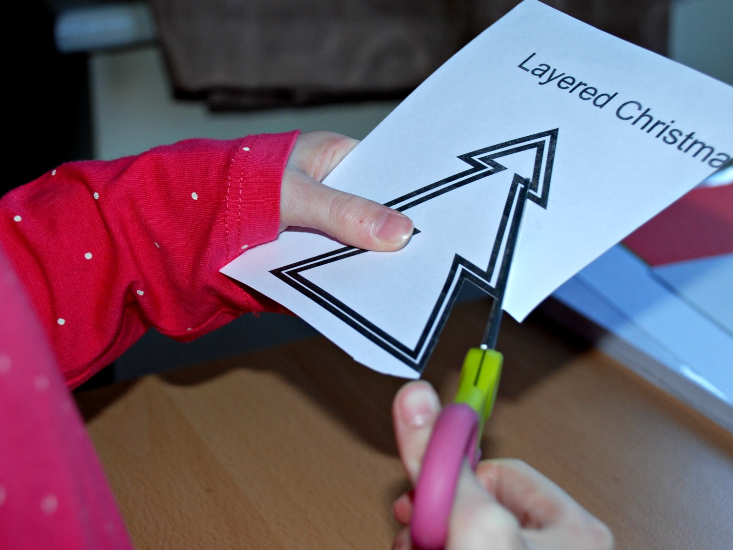 Christmas tree template from Activity villageAnd then the kids cut out their trees and stuck them onto thick coloured paper to make their cards.