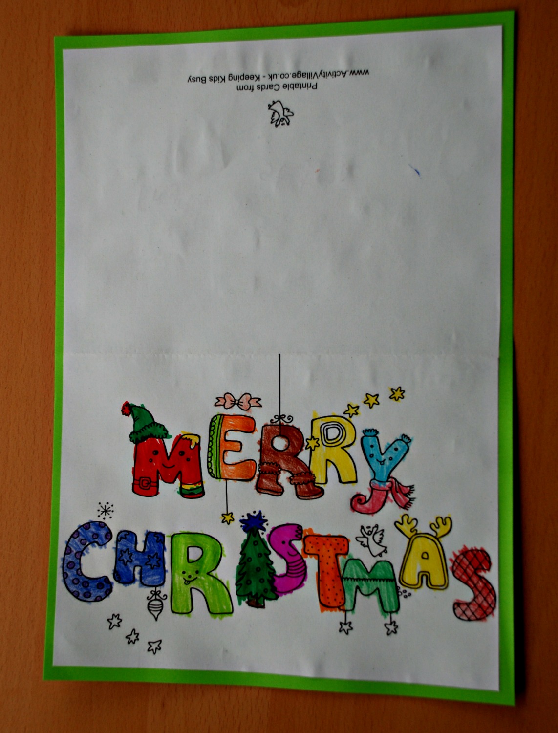 Merry Christmas colouring card stuck onto some coloured paperMy daughter liked this idea so much that we also added some red paper.
