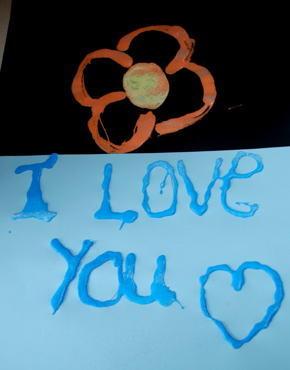 Sand words - writing phrasesIt ended up being a fun way of him practicing his letter formation.  And the fact that the glue did not always trace over the words perfectly worked for him as he would tell me afterwards – the a is not supposed to have the line in it should be like this – and he would draw the a in the air for me.