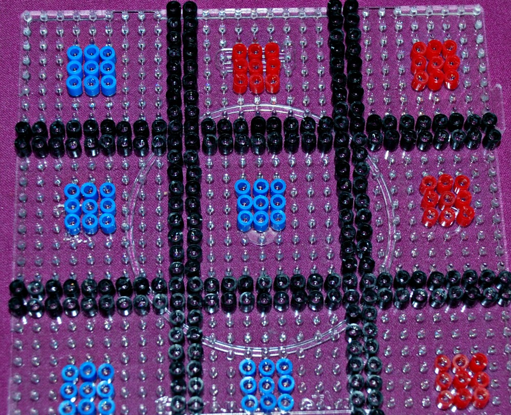 We quickly realised that the traditional crosses when made with Hama beads are just not strong enough for little people who sometimes can be a bit excited when they play the game. So we substituted the noughts and crossed with some red and blue rectangles (why rectangles ? – well that was just the shape that my youngest choose and he ended up making them all so we went with rectangles).