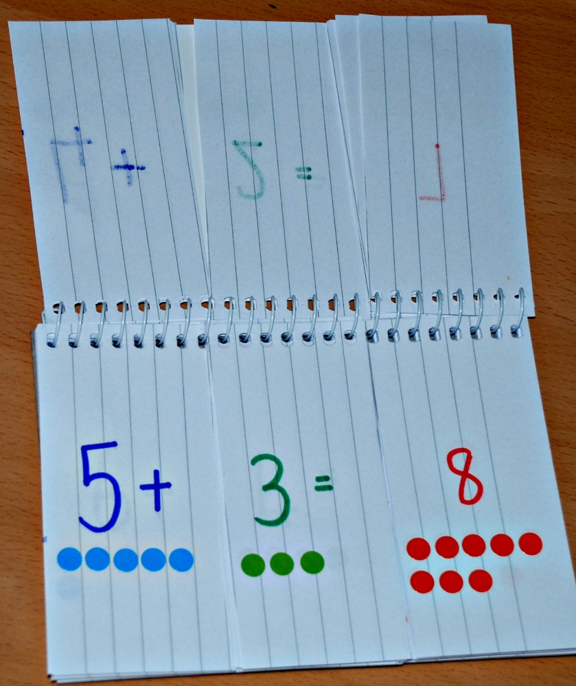 Same concept as his sisters but as he is only starting to work on his addition sums I also included some round sticker dots for each number. This was so that he could check his answers himself (ie the dots on the one side of the equals sign need to be the same as the number of dots on the other sign of the equals sign.) With his sticker dots I also organised them in rows of 5 as I wanted to re-enforce the idea that 10 is 2 groups of 5 or that 7 is 5 plus 2 etc. (And for the A6 spiral notebook that I used the rows of 5 also fit in very nicely on the strips of paper.)