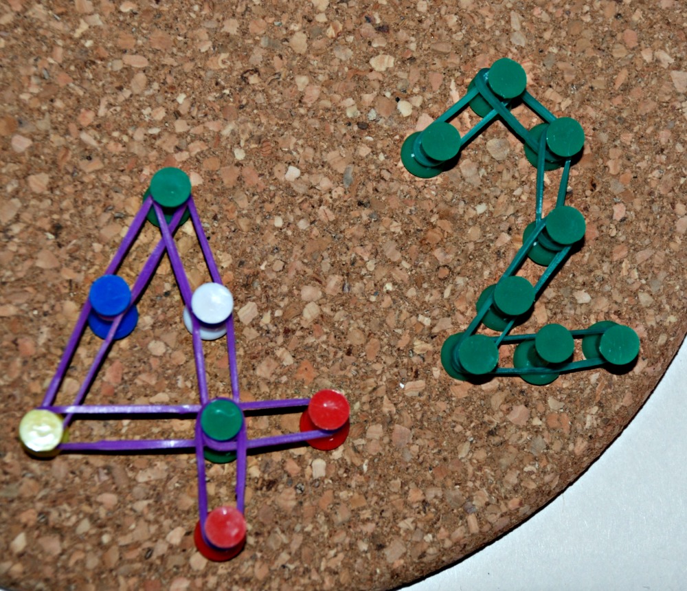 My daughter did a few shapes but she quickly moved onto creating numbers. The 5 below took 3 attempts to get it just the way she wanted but once she got a hang of it there was no stopping her and she did a bunch of numbers. (Tip from my daughter – when you need to place the drawing pins close together to get the right shape it helps to loop the loom band over twice).