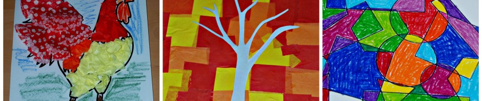 1. Collages – oh we have done so many of these. I often print off some colouring pages and then we use whatever is on our art cart or we raid the kitchen for some pasta and beans. Honest anything goes with this one. Pictures below are from our animal crafty post and Elmer.