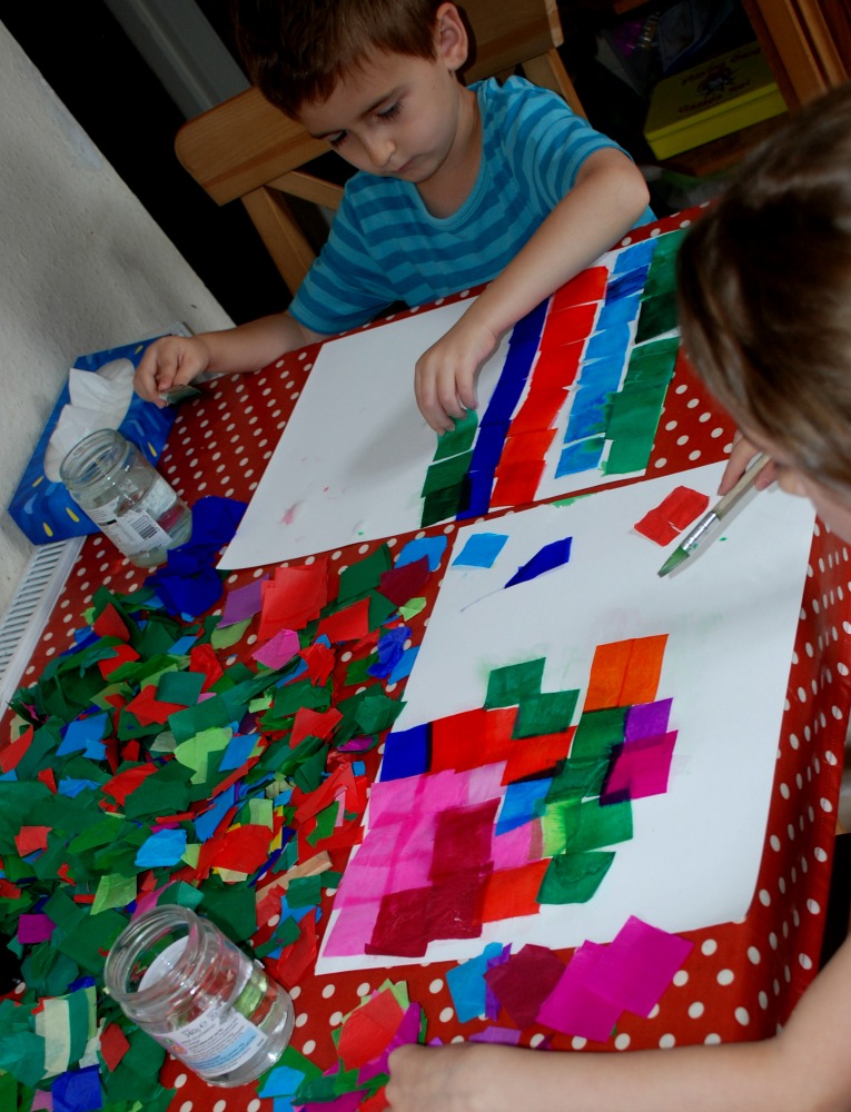 We started off creating the colourful pages. We tried two different methods – first we tried some bleeding tissue paper. We have done this a few times before so the kids know what to do. We add some tissue paper to card (we prefer using card for this as my son can be a bit over generous when he adds the water), then the kids dip their paint brushes in some water and “paint ” over the tissue paper so it is wet and the colours bleeds into the page. We leave it to dry and they peel off the dry tissue paper.