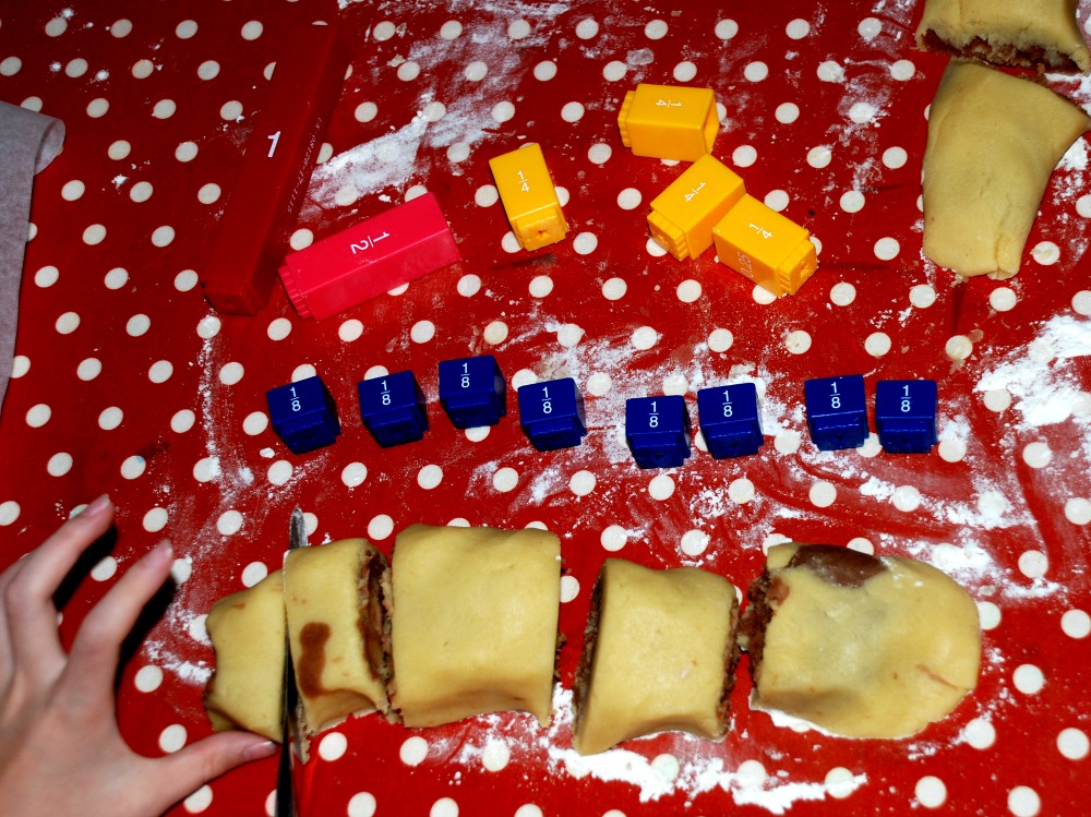 We started when we were baking some cookies, it was a basic cookie dough recipe, you roll the cookie dough into a long sausage shape and then slice it and place the slices onto the baking tray.  She has done this a number of times before but because we had just been using our fraction towers to show her brother something, I suggested we place the pieces on our kitchen table and see if we could work some fractions in.  Totally winging it I suggested we try to cut the cookie dough in half and then divide each of those halves into half again (so we got quarters) and then divide those quarters into half again (we would get eighths) and finally divide the eighths in half again (sixteenths).