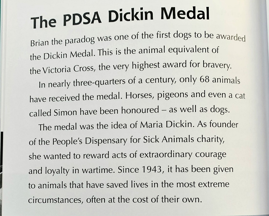 Although the book talks a lot about the First Wold War and how using dogs developed during the First World War it does also go on to talk about dogs in the Second Wold War and Military dogs today. It also mentions the PDSA Dickin Medal, which has been awarded to some military animals – we loved learning about this.